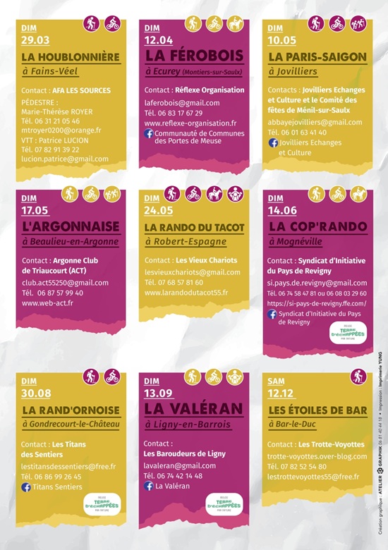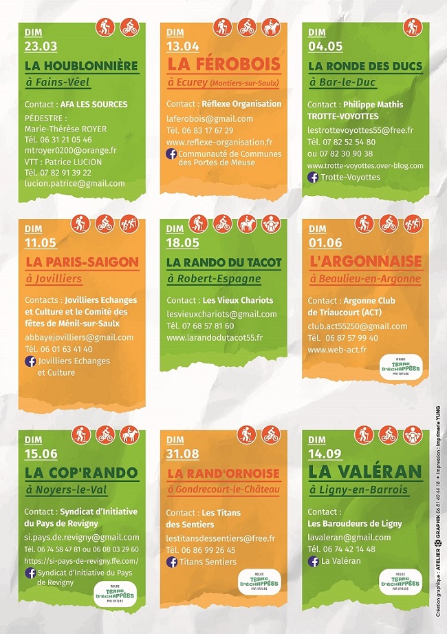 Programmées tout au long de l’année, les Randonnées Incontournables sont des grands rendez-vous de randonnée, pédestre, VTT et équestre à dimension éco-responsable, qui se déroulent dans le sud meusien.